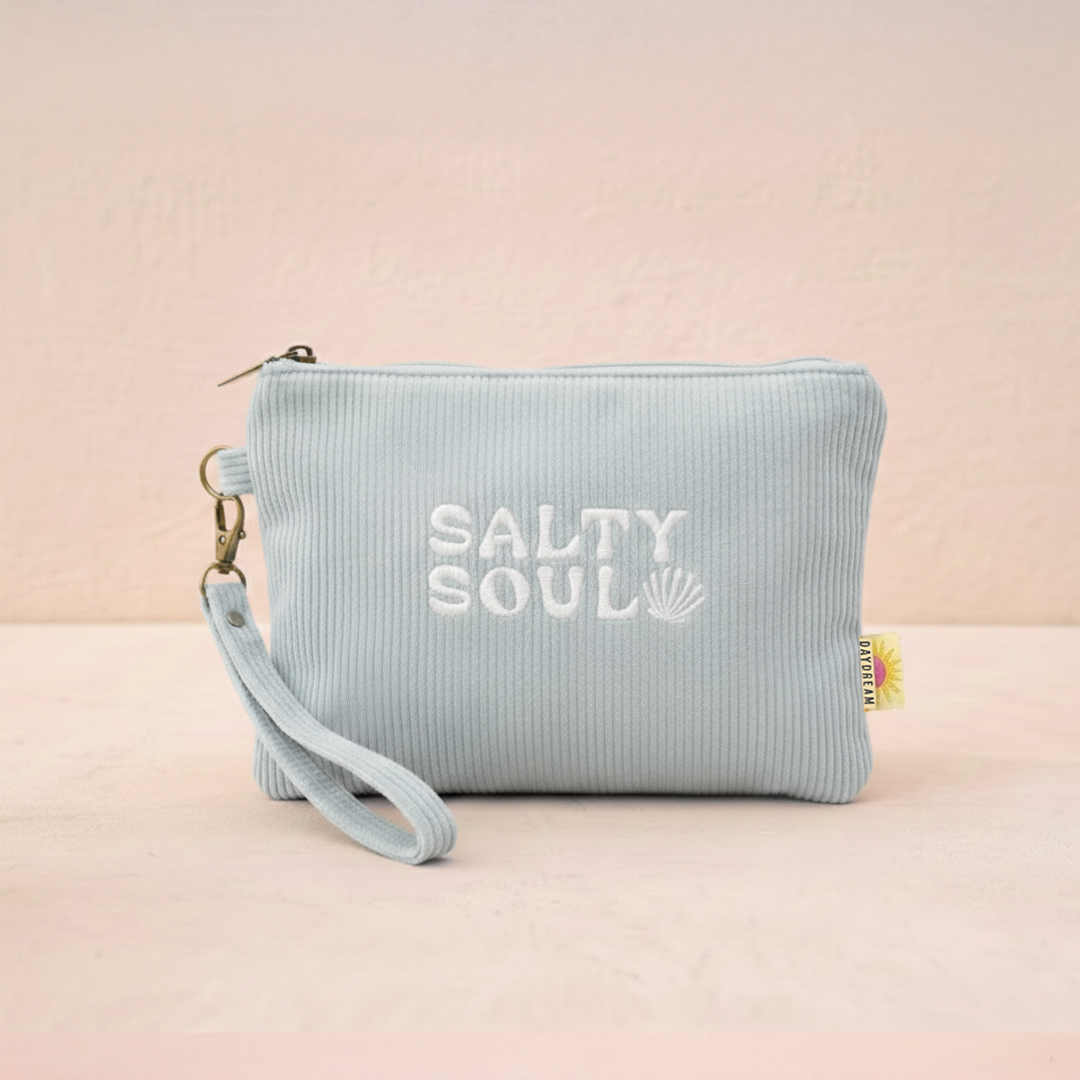 A Salty Soul embroidered corduroy wristlet pouch that brings instant summer coastal style to retail displays. This beach inspired zipper pouch features bold wave and sunset embroidery in warm vacation tones that photograph beautifully and stand out on tables, peg walls, and seasonal windows. A colorful, easy to style wholesale summer accessory that adds texture, personality, and a relaxed salty beach moment to any shop floor.